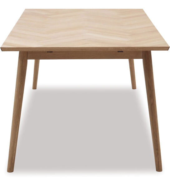 Bring timeless elegance to your dining space with the Casola extension dining table. Designed with a refined parquet tabletop in natural oak, this table blends craftsmanship and contemporary style. Perfect for both everyday meals and special gatherings, the Casola dining table easily extends using two leaves at the each end of the table. The Casola dining table offers generous space when you need it most. Its clean lines and tapered legs create a light, modern silhouette, while the parquet pattern adds warmth and character to your home.