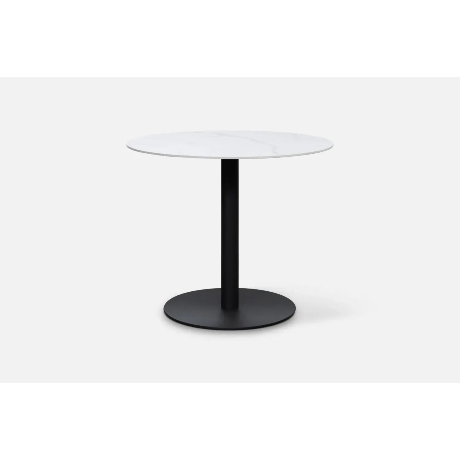 The Masca round dining table is a testament to space-savvy elegance. Crafted from aluminum and adorned with a stunning white sintered stone top,