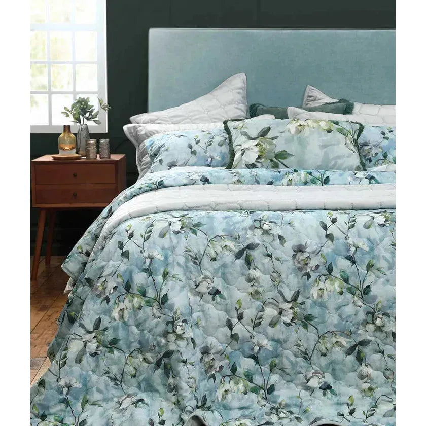 Softly sophisticated and subtle, the Tranquille Bedspread Set by MM Linen appears washed in textural muted blues that combine with the freshness of white florals.