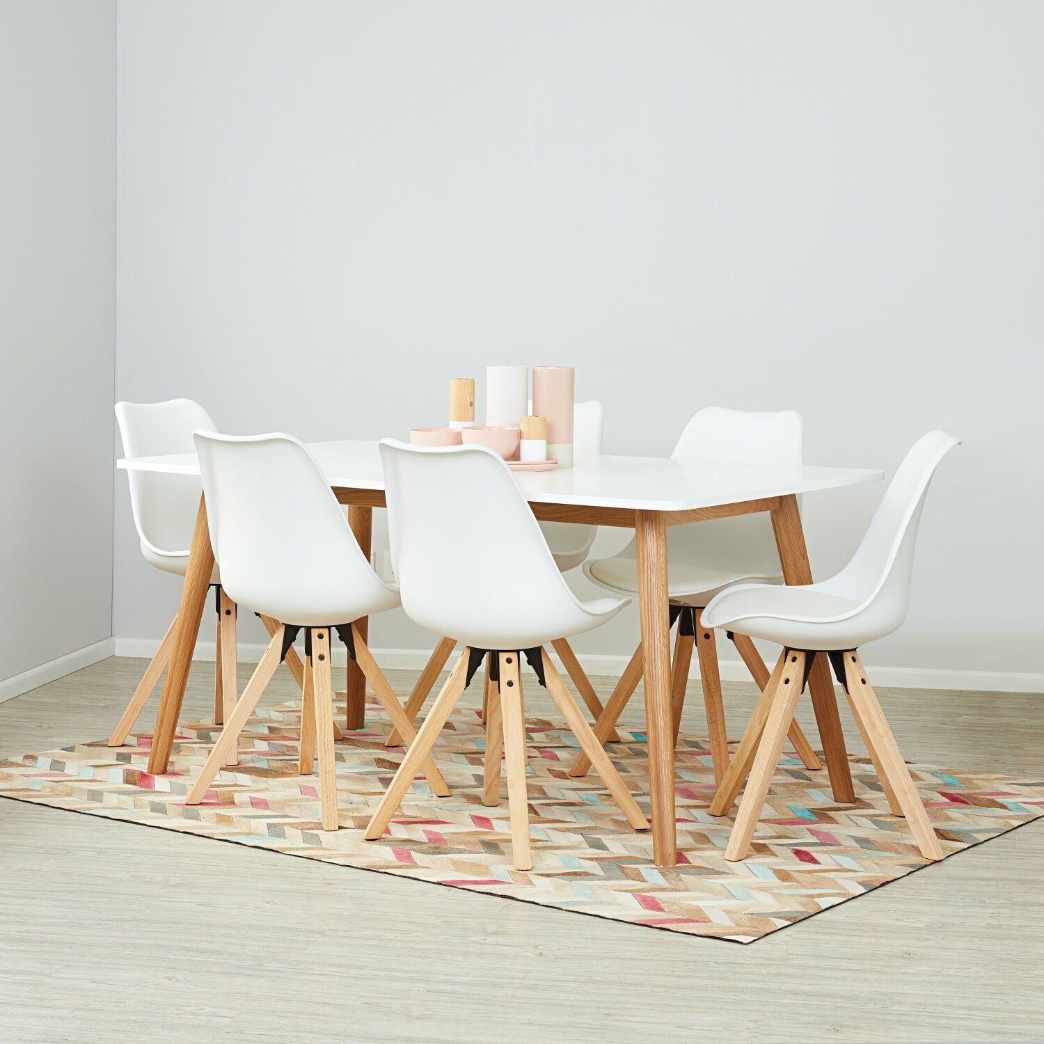 Functionality and simple, clean lines is what has defined Danish design over the decades. These elements are represented in spades in the ultra-modern Turin dining table and Dima dining chairs. The Turin dining table features oak timber legs and a white lacquered top. The plastic shell Dima dining chairs are available in a choice of two colours and feature a padded seat cushion for comfort.